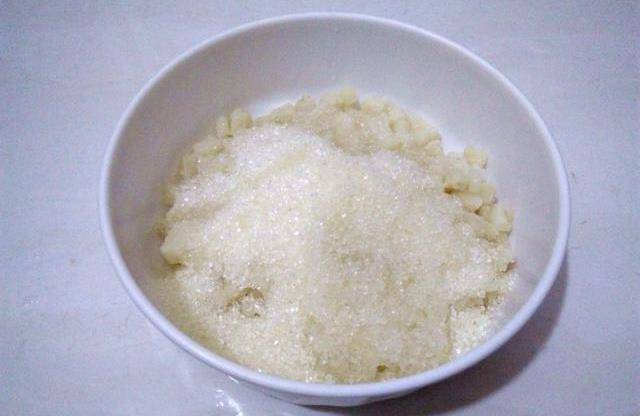 第二步:肥肉撈出過涼水,再瀝幹水分,放入適量的白砂糖和高度白酒,醃制一天,如果不急著做,放冰箱裡醃上半個月更好。這裡分享一個冰肉制作配比,200克肥肉放200克白砂糖,加4克高度白酒。