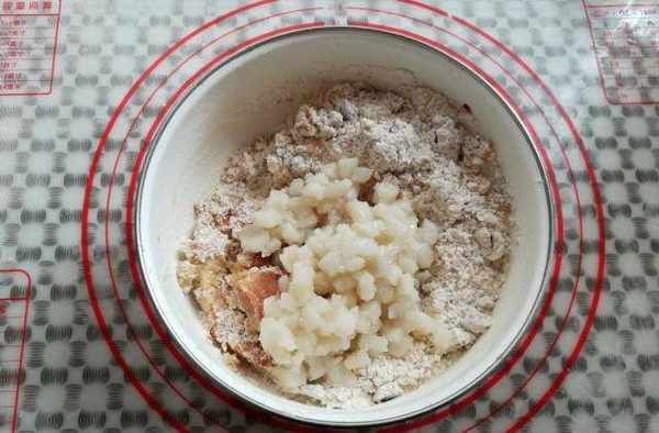 第六步:加入醃制好的冰肉,冰肉是廣式包子和五仁月餅以及雞仔餅中常用的食材。加瞭冰肉的糕點吃起來脆爽不甜膩,如果少瞭冰肉,就不叫雞仔餅瞭。