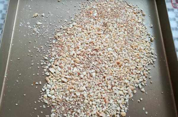 第三步:花生米和白芝麻用鍋炒香,去皮後跟白芝麻一起放到盤子裡,用搟面杖搟碎,白芝麻在盤子裡起緩沖作用,這樣花生米不會被搟得特別碎。