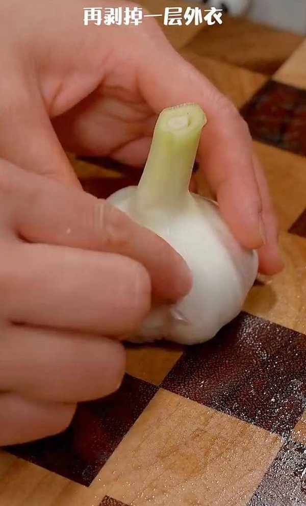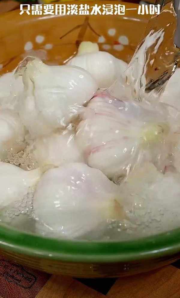首先,將蒜頭根部切掉。再剝掉一層外衣,隻需要留下天生的一層就可以瞭。這裡需要註意的就是如果想要做出來的蒜吃起來沒什麼口氣,還不燒心,隻需要用淡鹽水浸泡一小時。切記,取出來的大蒜,一定要頭朝下控幹裡邊的水分哦。