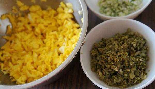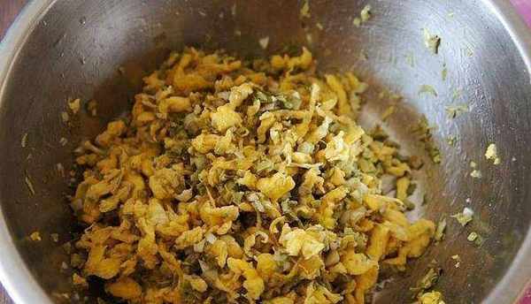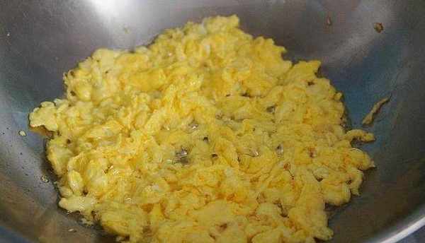 2、鴨蛋打散,加入幾滴白酒攪拌均勻(什麼白酒都可以),炒鍋加入適量的油,略多一點,拌餡時不再另加油瞭。油開加入打散的鴨蛋迅速攪拌成小碎塊,出鍋備用;
