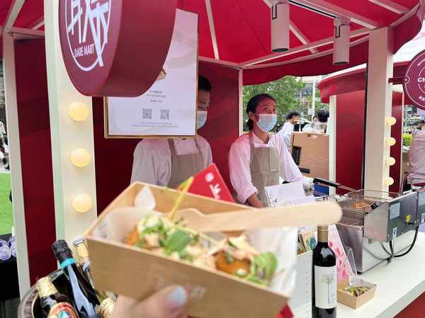 1515牛排坊帶來瞭1515蟹肉餅,工作人員手上厚厚一沓小票,顯示出極旺的人氣,“本來想現場帶牛排,但鑒於監管要求,改成瞭更加平易近人的肉餅。”同一集團的夏宮則在對面“練攤”,帶來瞭烏冬面和炸芝士海鮮卷。