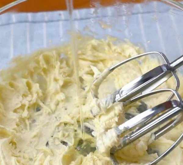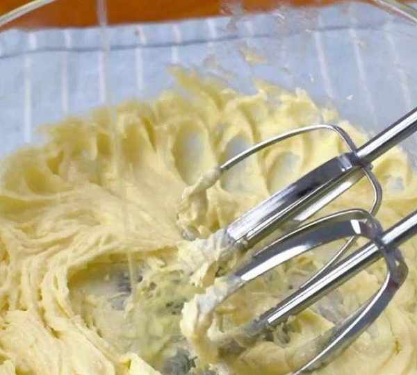 第3步、蛋清少量多次加入,混合之後再加入下一次,直到完全混合為止,黃油打發至淺黃色呈現羽毛狀就可以瞭。