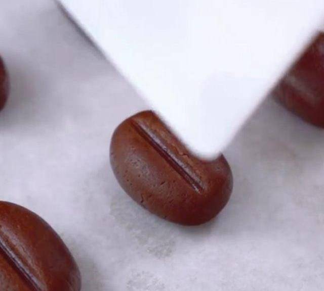第6步、用刮刀在小面團中間按上一刀,這樣咖啡豆的造型就做好瞭,然後放入提前預熱好的烤箱,170度烤20分鐘。