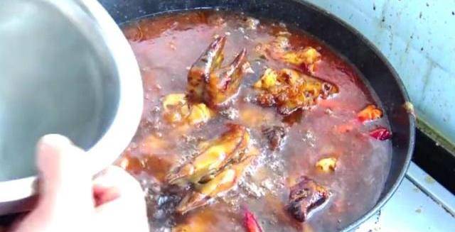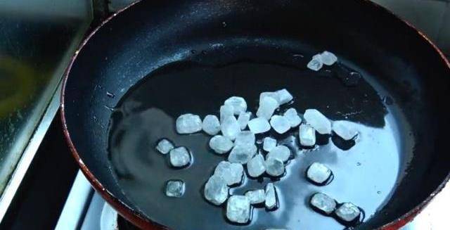 加好水之後我們開始煮,在煮的期間我們現在開始在另一邊熬糖,我們在鍋裡加入適量的底油,準備一把冰糖,把冰糖給熬化,然後熬成棗紅色的就行瞭,在熬糖色的時候我們切記一定要小火,千萬不能大火!