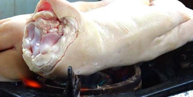 下面開始制作,這是小編從市場上買回來的四個豬蹄,味道有點腥味,現在我們把豬蹄用火燒一下,為什麼要燒一下就是為瞭去除一下它表面的豬毛,不然一口一嘴毛誰心裡也不舒服對吧!