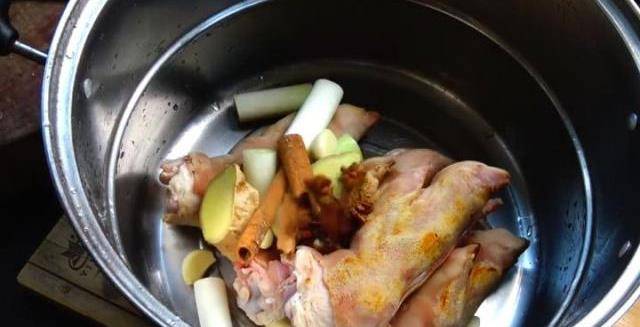 鍋裡加上水,把水燒熱之後我們把燒好的羊蹄放進去焯一下水,要放的調料有料酒適量,目的是為瞭去腥味,由於羊蹄的膻味比較大所以我們焯水的時候時間可以長一點,在羊蹄焯水的過程中我們開始準備其他調料!