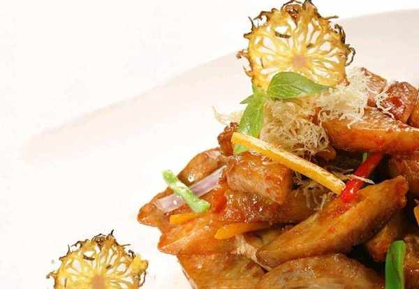 取炸透的土豆絲點綴,盤邊上淋入少許的燒汁即可