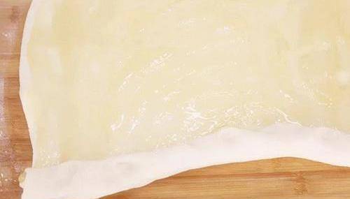 5、把面團搟開,把油酥均勻的抹在上面。由一邊開始把面餅卷起來,邊卷要邊拉撐一下面餅,這樣卷的層次就會比較多。