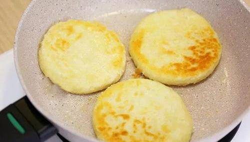 9、取一個小劑子搟開,搟成餅狀,所有的全部搟好。平底鍋內倒入少許食用油,然後將餅胚放入鍋內,小火烙制。烙制一面金黃時翻面,直至雙面金黃、熟透即可取出。