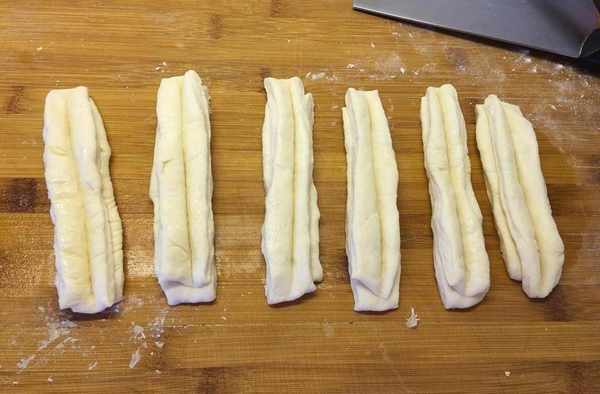 (6)用刀切成長條,兩個疊放在一起,用筷子壓一下;