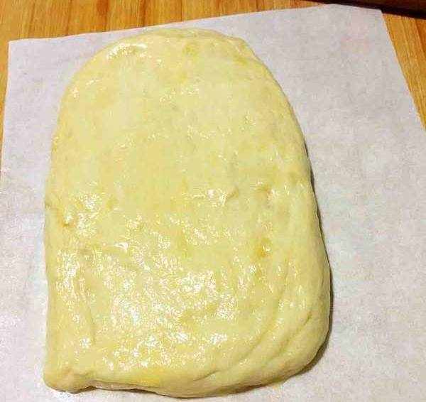 (5)案板上鋪張烘焙用的油紙,取出面團,戴上一次性手套將面團表面塗上一層油,刀和一根筷子也抹上油,用手將面團輕輕按壓成長10厘米,寬5厘米,厚度在2厘米的長方體;