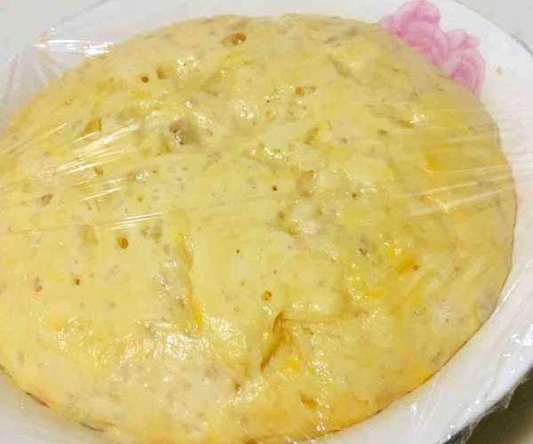 (4)揉成光滑的面團,蓋保鮮膜發酵至佈滿孔洞(冬天室內十幾度,發酵一晚,基本就可以)