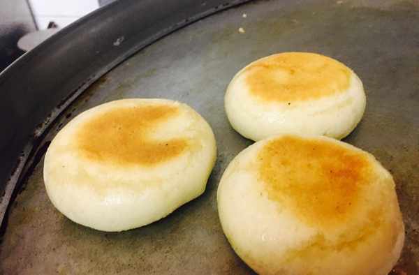 第三步:和好的面團在案板上揪成大小一樣的劑子,然後用手揉成圓形按扁放進電餅鐺裡烙成兩面金黃後拿出從中間切開一個口子,肉末和尖椒香菜拌勻夾在圓餅裡即可瞭,整個過程不用半小時是不是很方便,而且我也適用過瞭不比外面的外賣差多少,傢人吃的很開心,同樣喜歡的朋友們趕快試試吧!