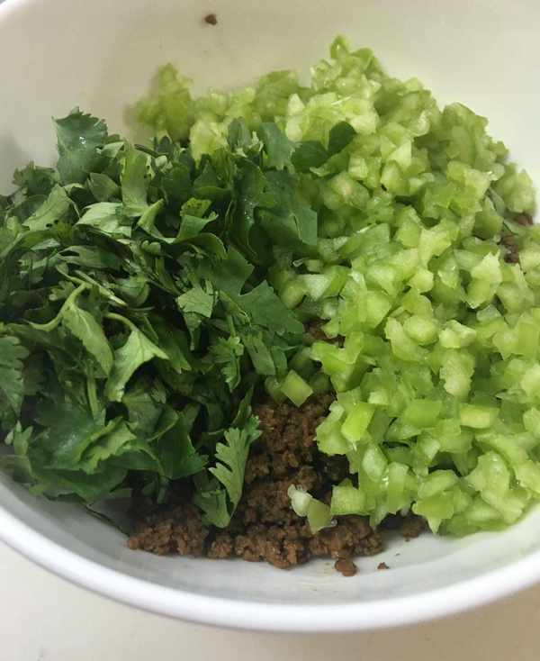 第二步:豬肉在案板上切成細粒,尖椒和香菜洗凈切碎備用,大蔥切末,炒鍋上火燒熱加入適量色拉油然後將肉末下鍋煸香加入蔥花,大火翻炒後加醬油上色,最後撒鹽調味淋香油出鍋