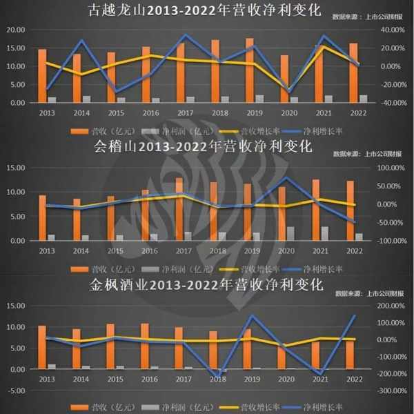 2022年,黃酒三巨頭,古越龍山凈利潤微增0.7%,會稽山同比下滑48.98%,金楓酒業雖然業績增長瞭125.76%,但那隻是因為上年虧損,去年扭虧為盈賺瞭500萬元,業績表現同樣不容樂觀。