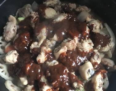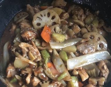 3、肉類燜熟後澆上醬汁,先不攪拌,燜2-3分鐘,然後充分攪拌均勻,菜葉類的可此時放入,不斷翻拌並開大火收汁,如果想多些汁就可關火出鍋瞭,盛盤後撒芝麻或香菜~