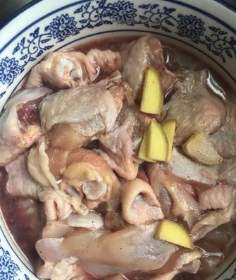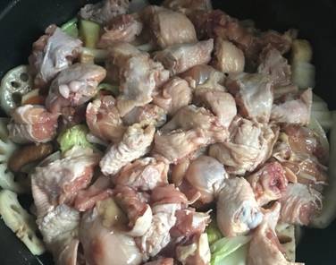 2、肉類:翅中對劈或者分三段(易進味好熟),雞腿切塊,牛肉切小塊,蝦整隻,也是喜歡放什麼都可以,將所有肉混合放料酒、黑胡椒粉或生抽,薑片醃制~