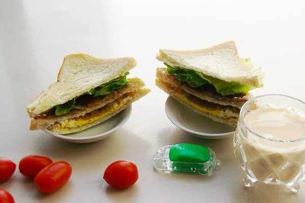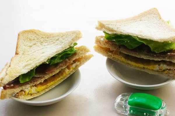 步驟三:食材準備好,接下來就是三明治的搭配啦,開始擺放。依次為吐司、煎雞蛋、吐司、培根、生菜、吐司。