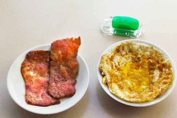 步驟二:把雞蛋和培根分別煎熟備用,可以適當切成和吐司差不多的大小,方便擺放。