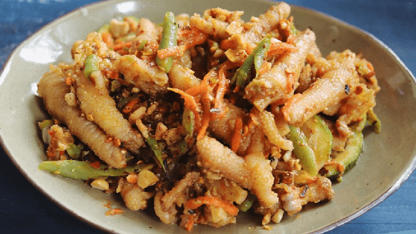 將雞爪解凍,除瞭好後,水中放入蔥花、薑片、料酒,再放入雞爪,大火煮開,十分鐘後撈出;用清水沖洗掉雞爪上的浮沫後,用冰水浸泡30分鐘;這樣可以使雞爪更有嚼勁,把香菜碎、蒜、小米辣椒、檸檬片、花生等調料和雞腳一起放入缽中碾碎,最後放入胡蘿卜絲、洋蔥絲等。當然,必要的鹽、生抽這些調味料也是必不可少的。