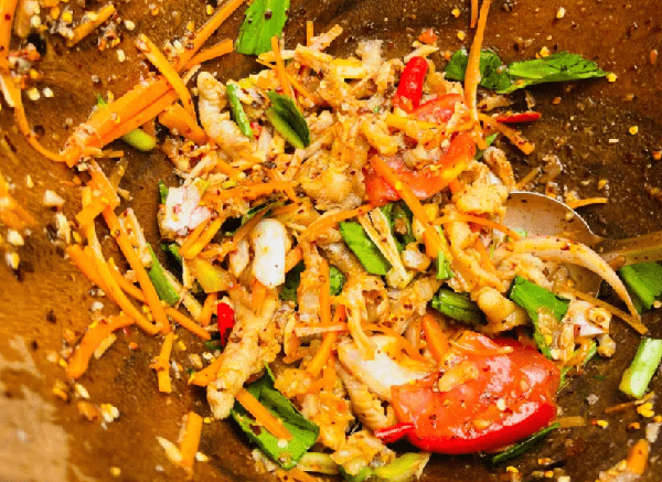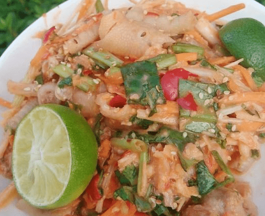 這樣,一道色澤艷麗,口感Q彈的特色美食——傣味舂雞腳就做好瞭。