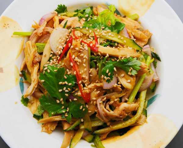 食材及調味:雞腿、洋蔥、黃瓜、香菜、小米辣、蒜、生抽、醋、鹽、糖、香油、藤椒油