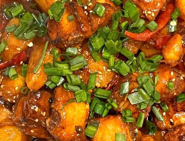 5、大火收汁加入青紅辣椒翻炒均勻起鍋