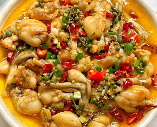 4、放入萵筍,金針菇,煮熟盛出裝盤,繼續放入牛蛙,大火煮3-5分鐘,裝盤撒上蔥花,幹辣椒,藤椒,淋上熱油就可以啦。