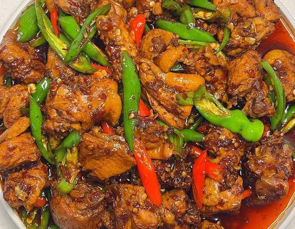 食材:半隻雞肉、青紅辣椒、一塊火鍋底料、香葉桂皮八角、大蒜生薑