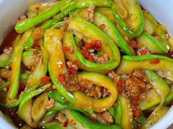 2、鍋中熱油,下肉末炒至變色,輔料加薑末,小米椒,一勺豆瓣醬,炒勻炒香炒出紅油,倒入西葫蘆,少許鹽和白糖,一勺老抽,最後大火翻炒5,6,7 下即可,這樣做的西葫蘆太下飯瞭,清脆好吃不出湯,3碗米飯都不夠吃
