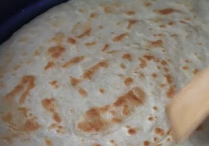 搟好以後,鍋裡刷油,放入面餅.用大火烙.餅的上面也刷上蔥油.