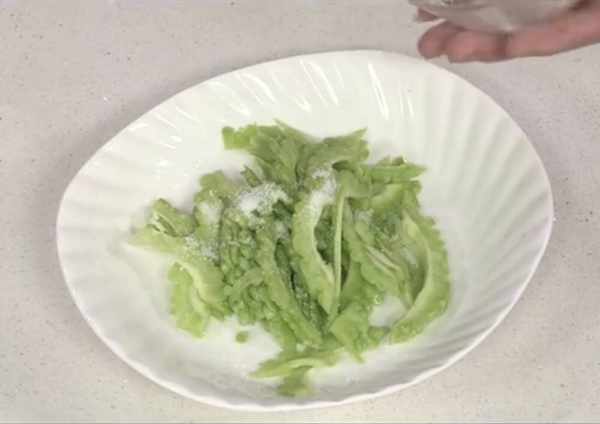 第三步:將苦瓜片裝入盤中,放一勺鹽,倒入少許清水,抓勻。
