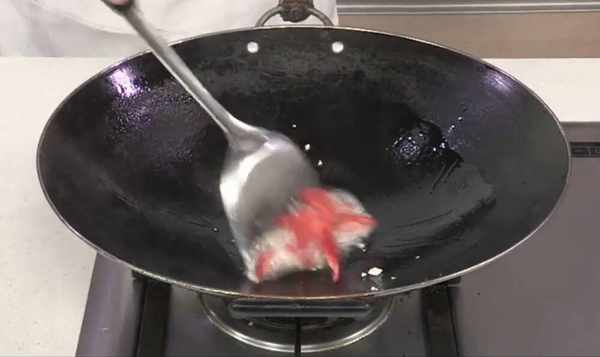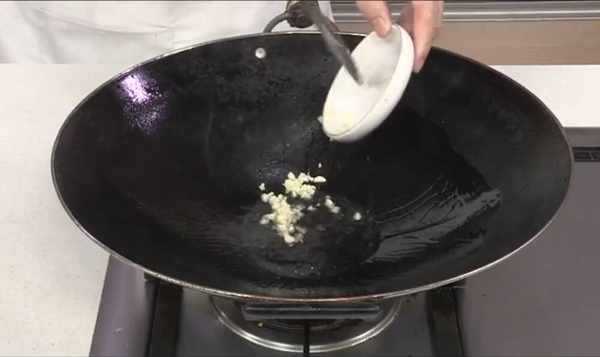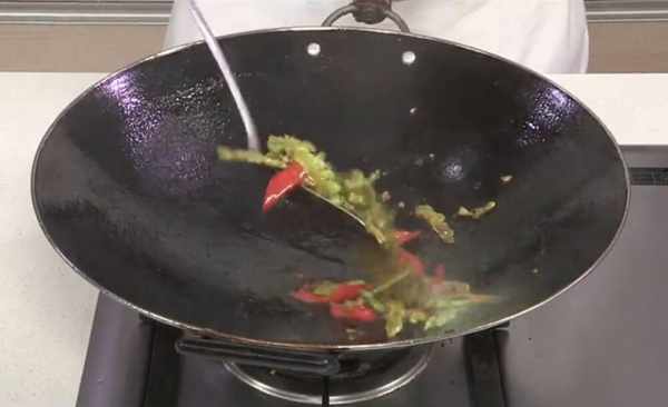 第六步:鍋中倒入適量食用油燒熱,下入蒜末、紅椒,炒出香味。