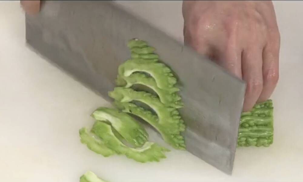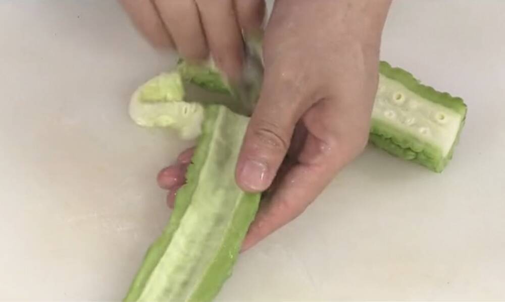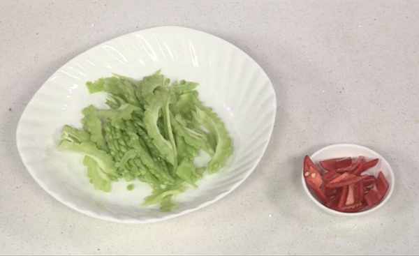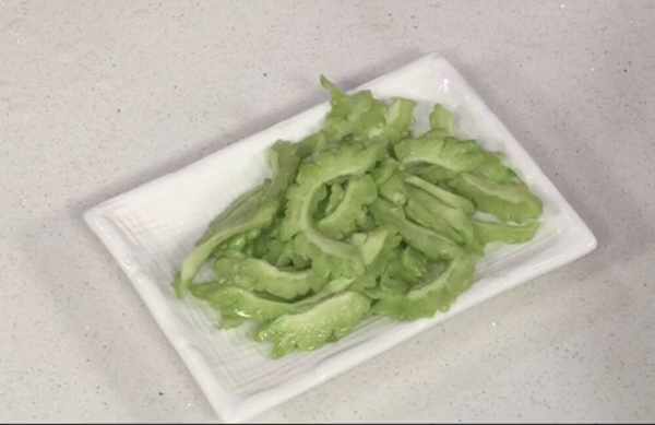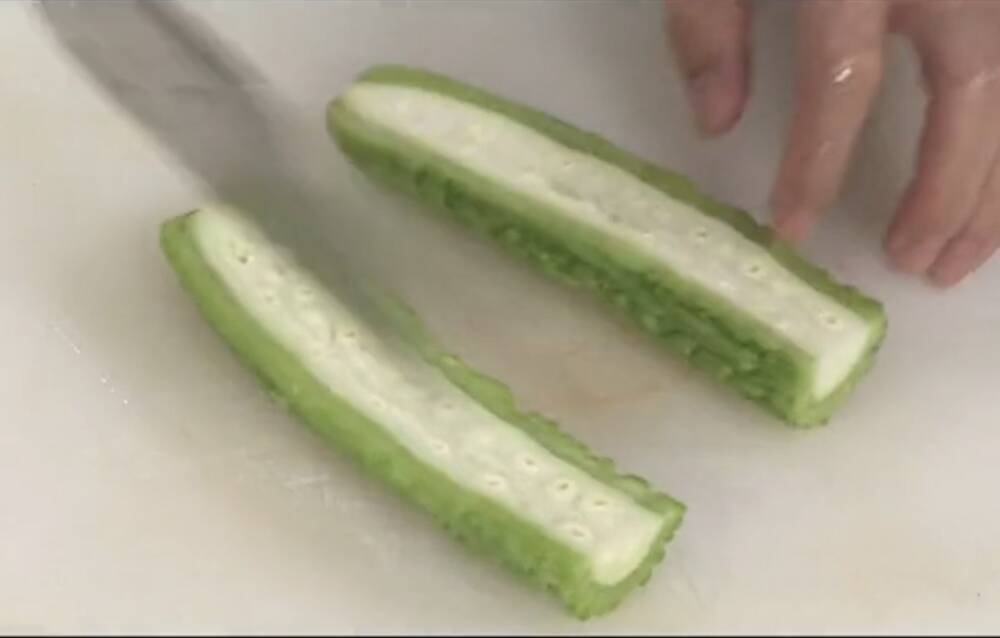 第一步:將洗好的苦瓜對半切開,去籽,切成片。