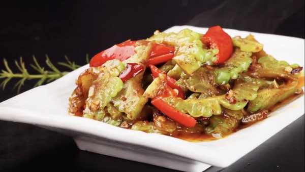 PS:炒制此菜時,辣椒醬和老幹媽醬不宜放太多,以免過辣,影響苦瓜本身的鮮味。