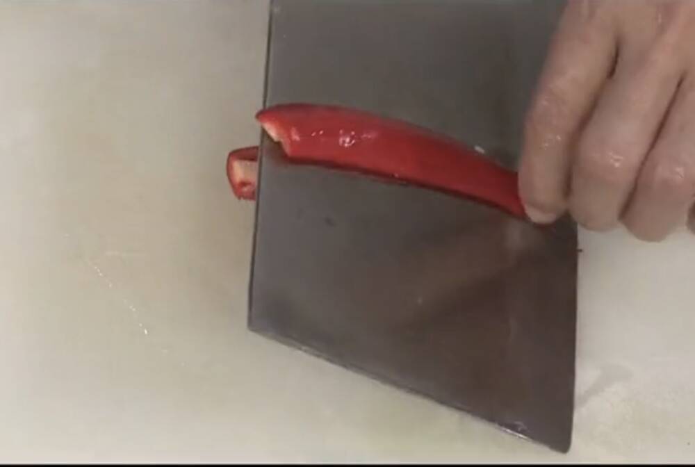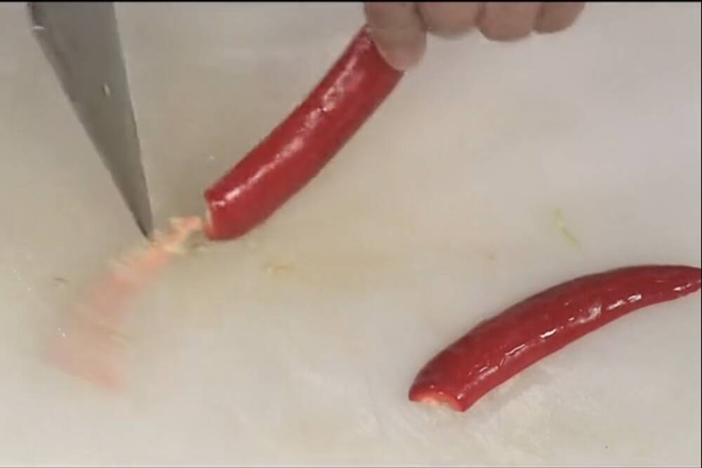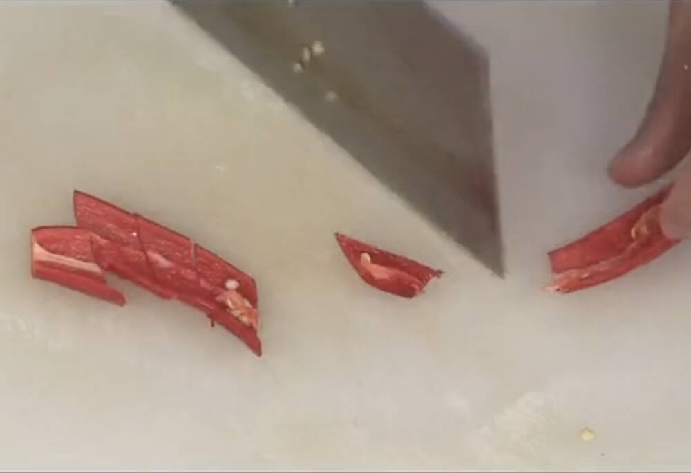 第二步:洗凈的紅椒對半切開,去籽,切成小塊。