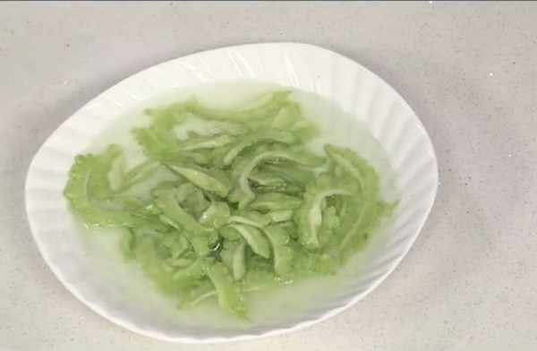 第四步:醃漬過的苦瓜片加入適量清水清洗。