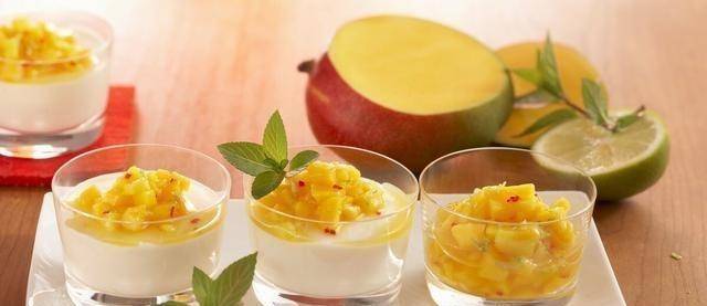 第四步:待白砂糖完全煮熟後,可以加入過濾前的檸檬汁,等到果醬在鍋裡濃稠瞭就可以拿出來放涼瞭。取一個已經消毒過的好看的玻璃瓶,慢慢倒入芒果醬,然後放入冰箱冷藏。