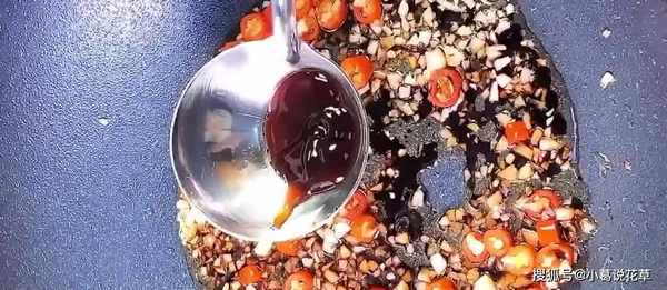 4、鍋中倒入少量底油。油熱後,加入切碎的大蒜和辣椒小米。香味出來後,加入少許生抽、老抽、蠔油,繼續炒香,炒出顏色後,倒入少許水,開火燒開。