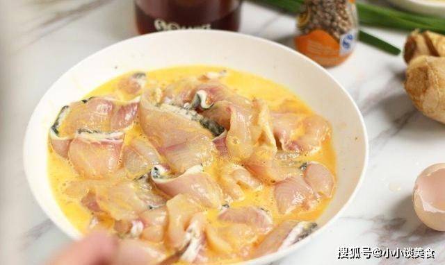 4.魚片瀝幹水分,加入1茶匙鹽、2克胡椒粉、1湯匙料酒和兩片薑,抓勻,將魚片中的汁液盡量擠入醃制。一會兒然後將其與75克全蛋淀粉糊混合。全蛋淀粉液是由全蛋液和淀粉按1:1左右的比例制成的漿狀物。最好加一勺油,防止炸的時候魚片粘在一起。