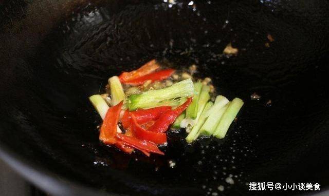 9、然後加入青蒜翻炒片刻,不斷攪拌。