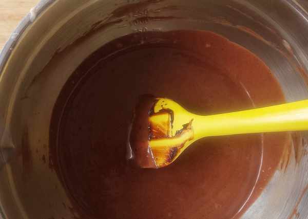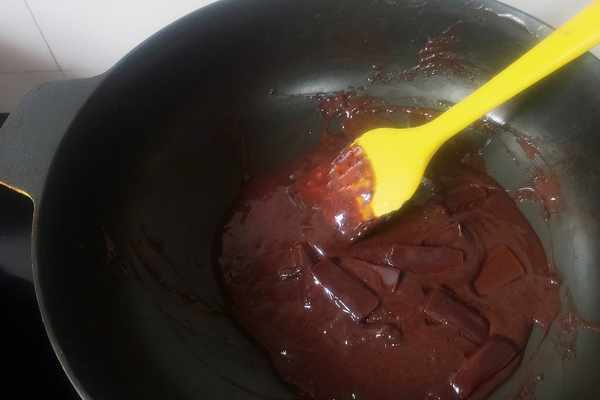 5、熬煮到鍋內液體變成濃稠的糊狀時,就可以熄火瞭。此時我們把黑巧下鍋,利用餘溫,將它融化。大傢可以看下步驟4和步驟5的圖片對比,很明顯的可以看出,經過長時間的小火慢熬,液體從最初的水狀,變成瞭濃稠的糊狀。