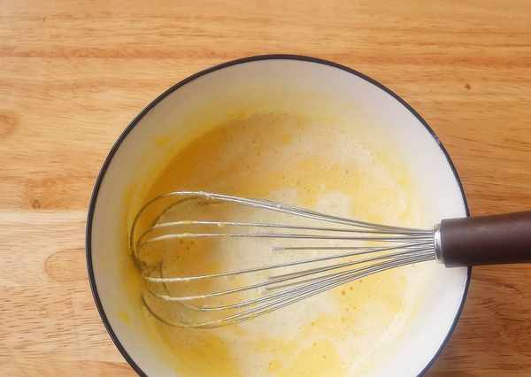 1、先將2個蛋黃和60克細砂糖倒入碗內,用手動打蛋器攪打至蛋液粘稠,且顏色變淺為止。然後再將180克純牛奶倒入蛋液碗內,繼續混合均勻