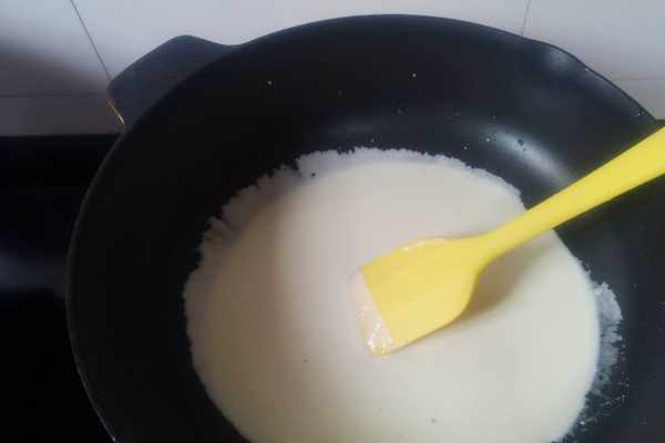 2、將混合好的蛋奶液倒入平底鍋內,小火加熱,一邊加熱一邊用刮刀不停攪拌