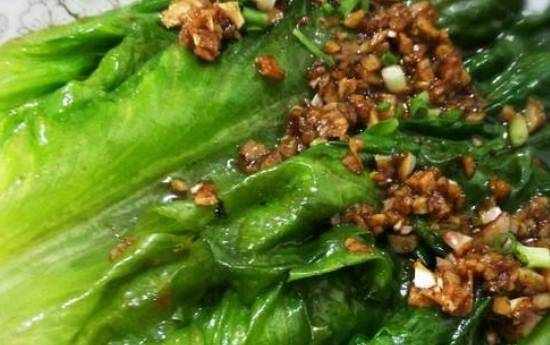 蒜蓉生菜,生菜有利五臟、通經脈、開胸膈、利氣、堅筋骨、白牙齒、明耳目、通乳汁、利小便的功效。做法:鍋裡熱油炒香蒜蓉,倒入生抽、蠔油、及砂糖,炒勻煮開,煮好的蒜蓉醬盛起備用,鍋裡熱水煮開,倒入少許油,接著放入生菜白灼半分鐘,盛起灼好的生菜,澆上蒜蓉醬即可。