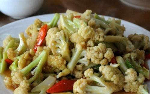 清炒花菜:首先花菜洗凈按花瓣切開小塊,鍋燒熱水,放少許鹽、油飛水備用,蒜頭拍爛。燒熱油鍋,爆香蒜頭撈起,放花菜下去爆炒一會(調味),鍋邊贊少許水加蓋一會,生抽、生粉兌水勾薄芡即可。