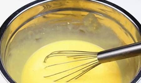 把雞蛋、白砂糖、蜂蜜、鹽、水、玉米油一起放入盆中,用手動打蛋器攪拌均勻。低筋面粉、奶粉、泡打粉過篩後放到蛋糊中,攪拌至沒有顆粒,然後蓋上保鮮膜放到冰箱冷藏30分鐘。