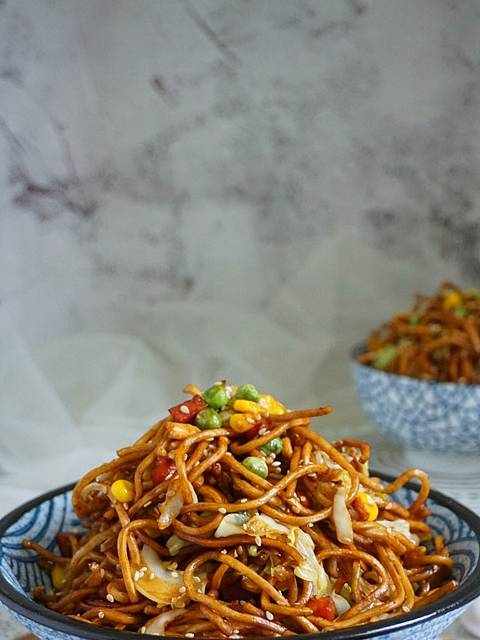 7.這步最關鍵瞭,出鍋前,在鍋邊淋一圈醋,繼續大火翻炒,這樣炒出來的面條,特別的香,放心吃不出酸味的,下次做炒面一定記住這個小訣竅哦。關火前,撒一把芝麻,淋幾滴香油。完成~!