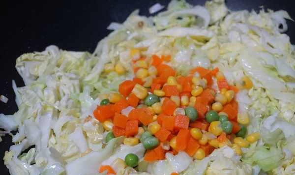 5.開中火,加入圓白菜,火腿丁,五彩時蔬,進行翻炒。五彩時蔬就是買的冷凍的,有胡蘿卜丁,玉米粒,豌豆粒,我傢冰箱常年冷凍著,當配菜什麼的再好不過瞭。